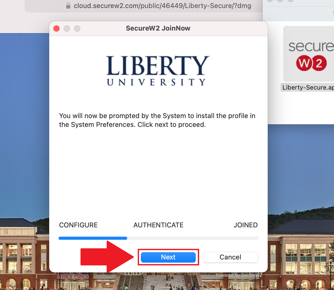 9. Next you will be prompted to enter your Liberty username and password. Once you have entered the information click Next.