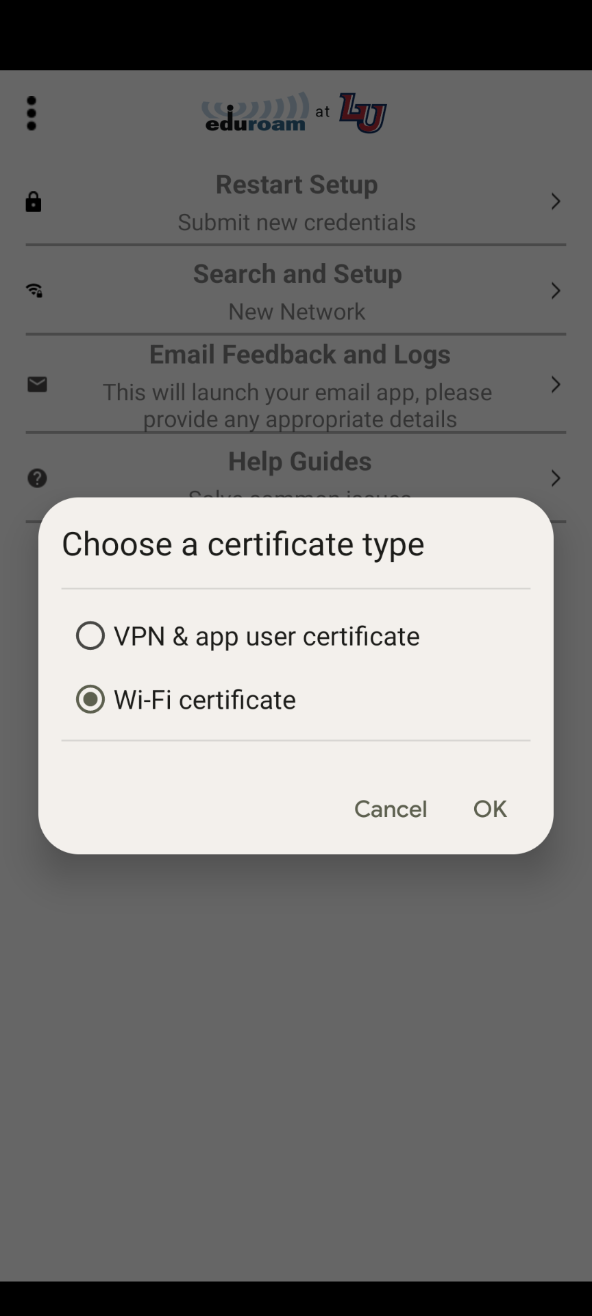 Onboarding is the process of connecting a PC or mobile device to the Liberty wireless network. Connecting to the Liberty wireless/eduroam network requires a wireless profile and certificate to securely connect the device. In most cases, this setup is as easy as connecting to our wireless onboarding network, running an app to configure the necessary certificates/profile, and then using your Liberty credentials to securely connect. The steps below will assist you in onboarding your device.