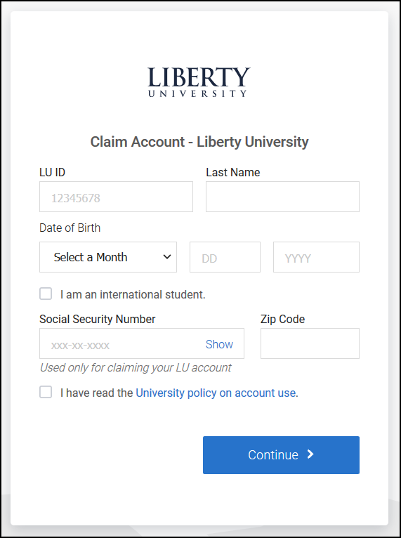 3. Enter your personal identification information as prompted. You will then need to check the check-box to confirm that you have read the University policy on account use. Then click Continue.