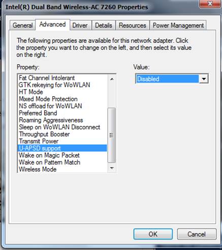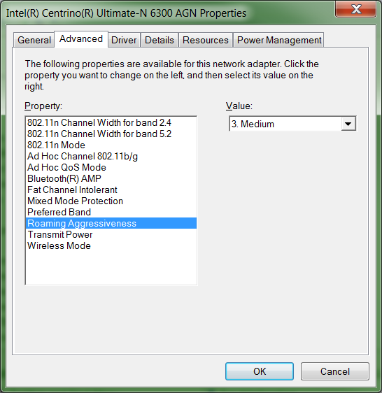 When applicable, please change the following wireless driver settings to the values below (accessible by right-clicking on the network driver in Device Manager, then clicking on Properties, then clicking on Advanced):