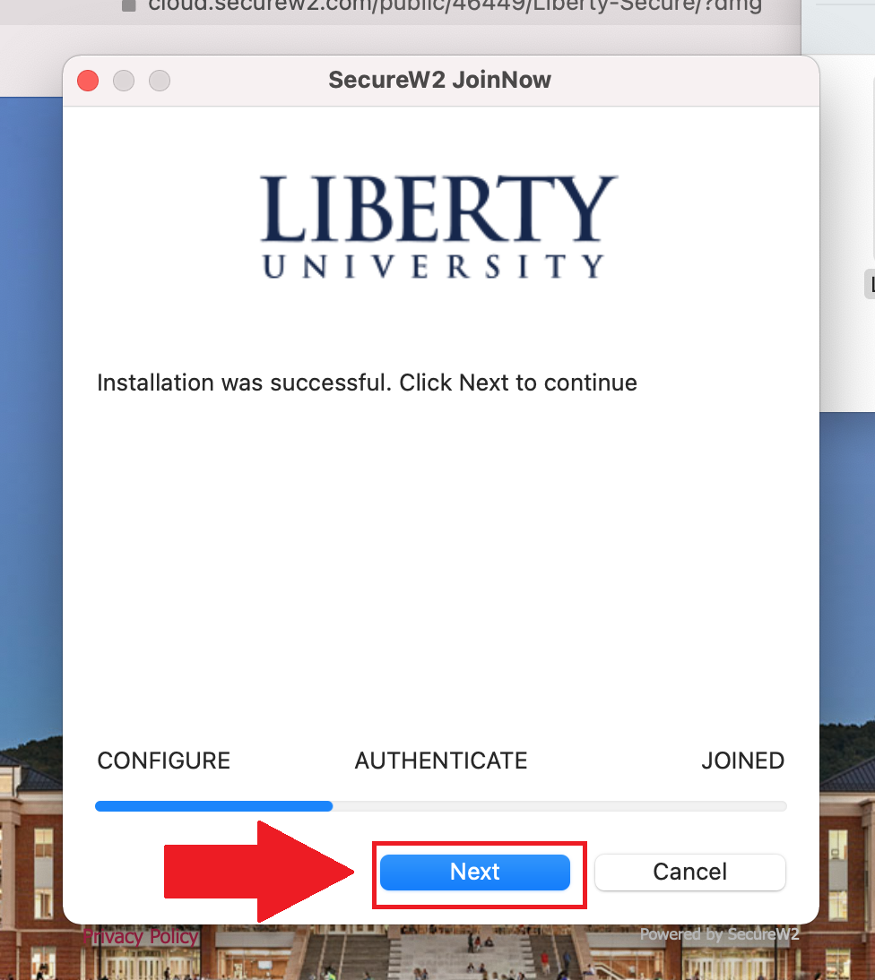9. Next, you will be prompted to enter your Liberty username and password. Once you have entered the information click Next.